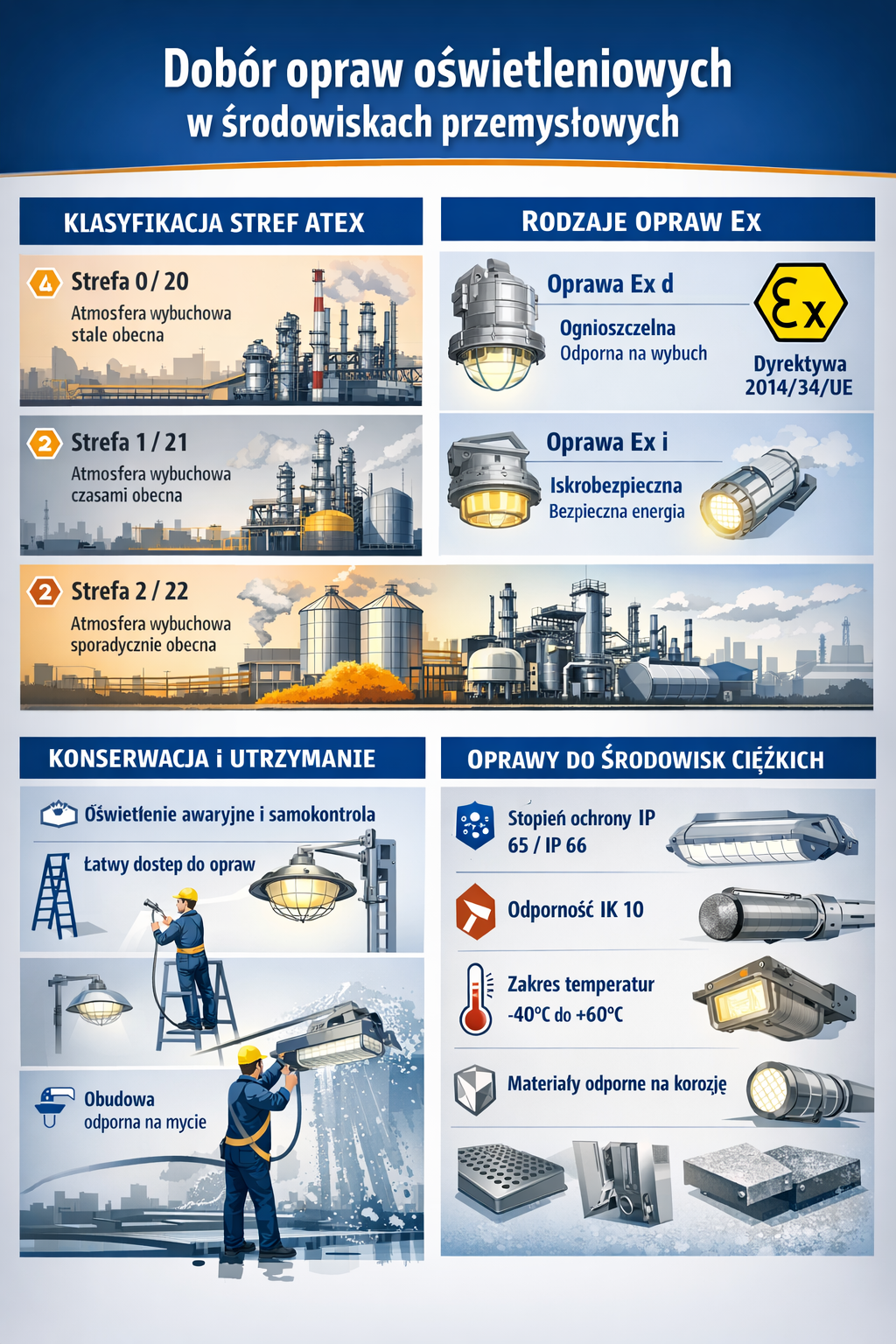 Systemy oświetleniowe stosowane w środowiskach przemysłowych oraz strefach zagrożonych wybuchem podlegają szczególnym wymaganiom, które wykraczają poza zapewnienie odpowiedniego poziomu natężenia światła. W zakładach przemysłowych, strefach o ograniczonej dostępności oraz w warunkach środowiskowych o podwyższonej agresywności oświetlenie musi być nie tylko funkcjonalne, lecz przede wszystkim bezpieczne, niezawodne, trwałe i łatwe w utrzymaniu.